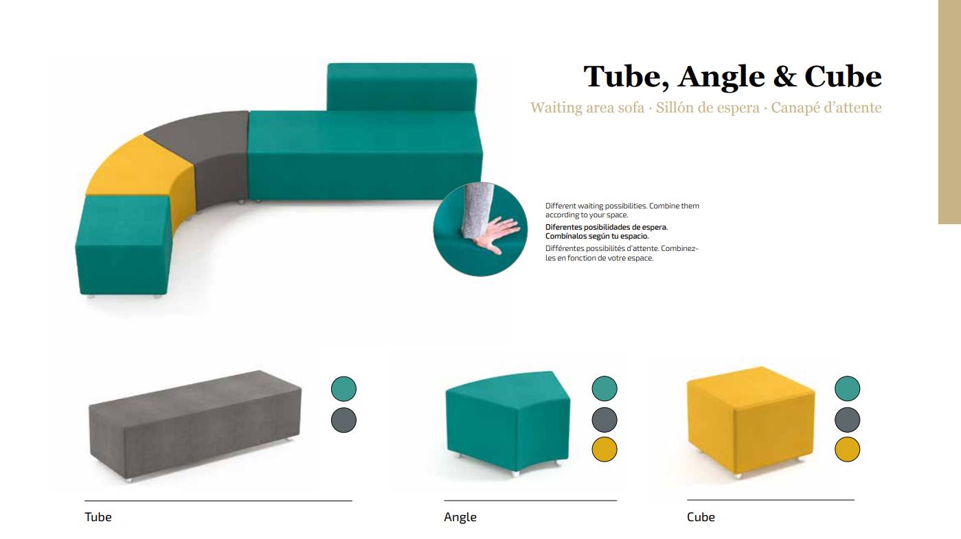 Os sofás combináveis ANGLE, CUBE e TUBE são soluções modulares que permitem criar layouts versáteis, adaptando-se a qualquer dimensão de espaço e reforçando a imagem profissional do seu negócio.