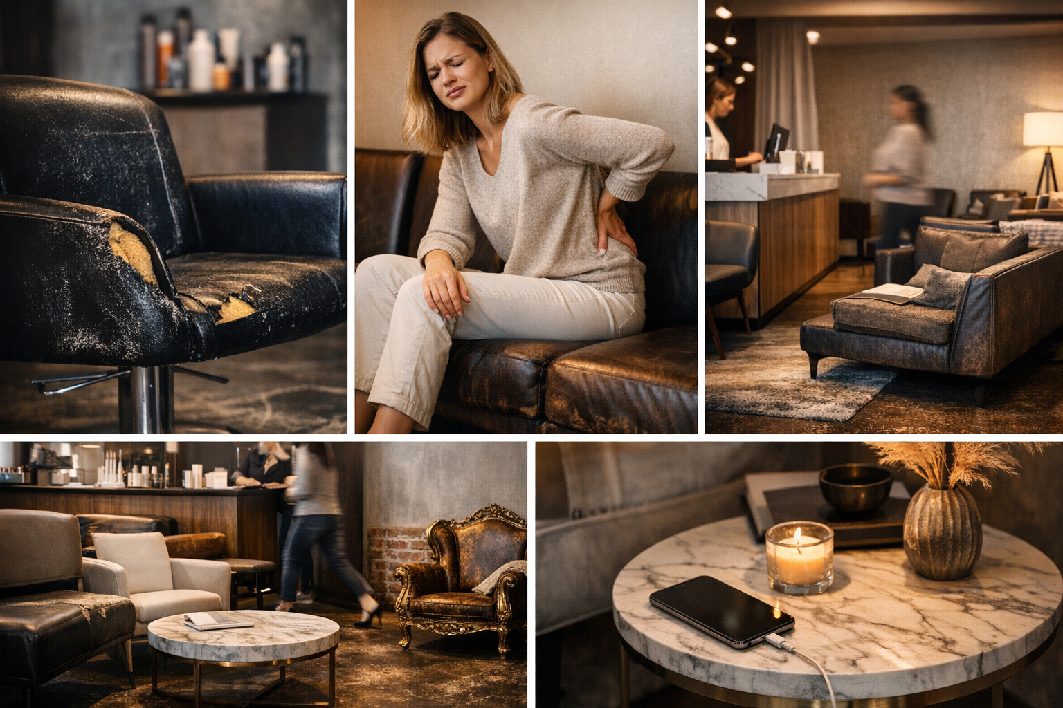 Como evitar: Escolhe peças ergonómicas, com densidade adequada e apoio correto. O cliente deve sentir-se acolhido desde o primeiro minuto.